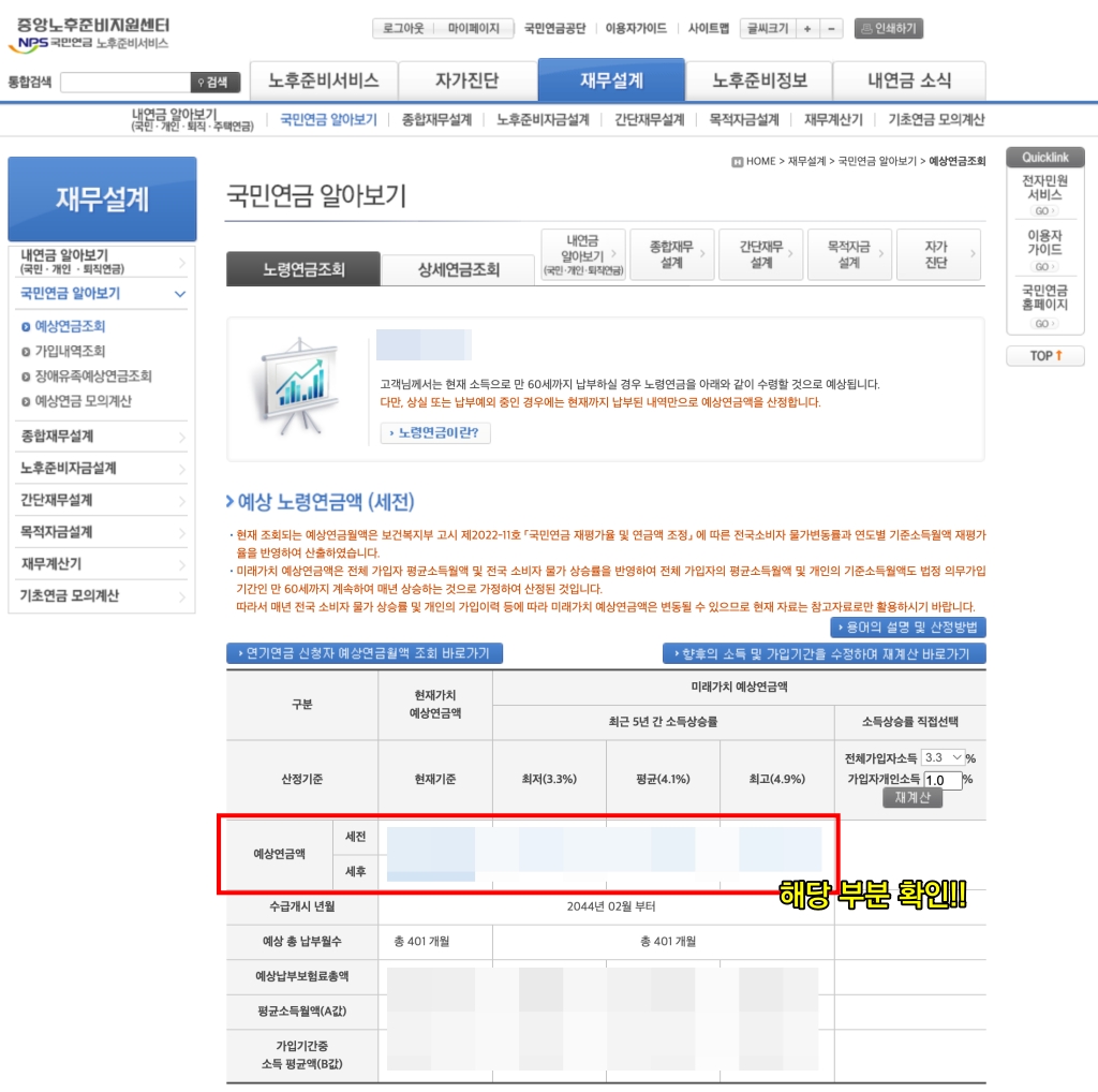 그러면 이제 마지막으로 본인의 예상 연금액을 확인할 수 있습니다. 위 화면은 제 연금수령액을 캡처한 회사이지만, 개인 프라이버시를 위해 국민연금 예상수령액 결과 화면은 가렸습니다.
