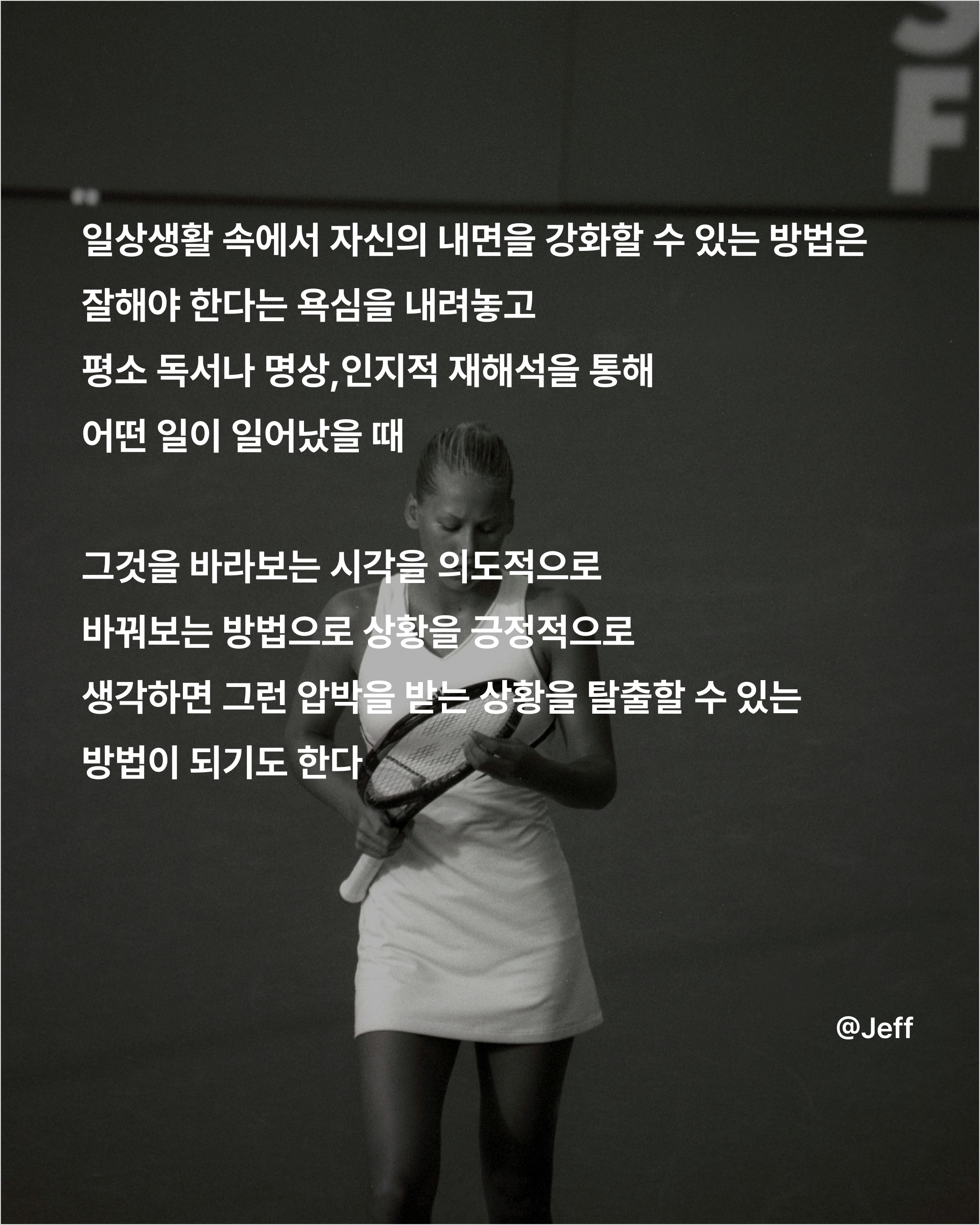 필자도 테니스를 오랫동안 취미 생활로 즐겨왔다. 취미 생활로 하는 운동도 막상 대회를 참가하거나 반드시 이겨야 하는 경기가 있다면 유독 몸에 힘이 많이 들어가고, 멘탈이 무너져 나의 플레이에 집중하기 보다는 상대방이 파이팅 하는 모습에 화가 난다거나 신경을 많이 써서 게임을 망치는 경우가 많다.