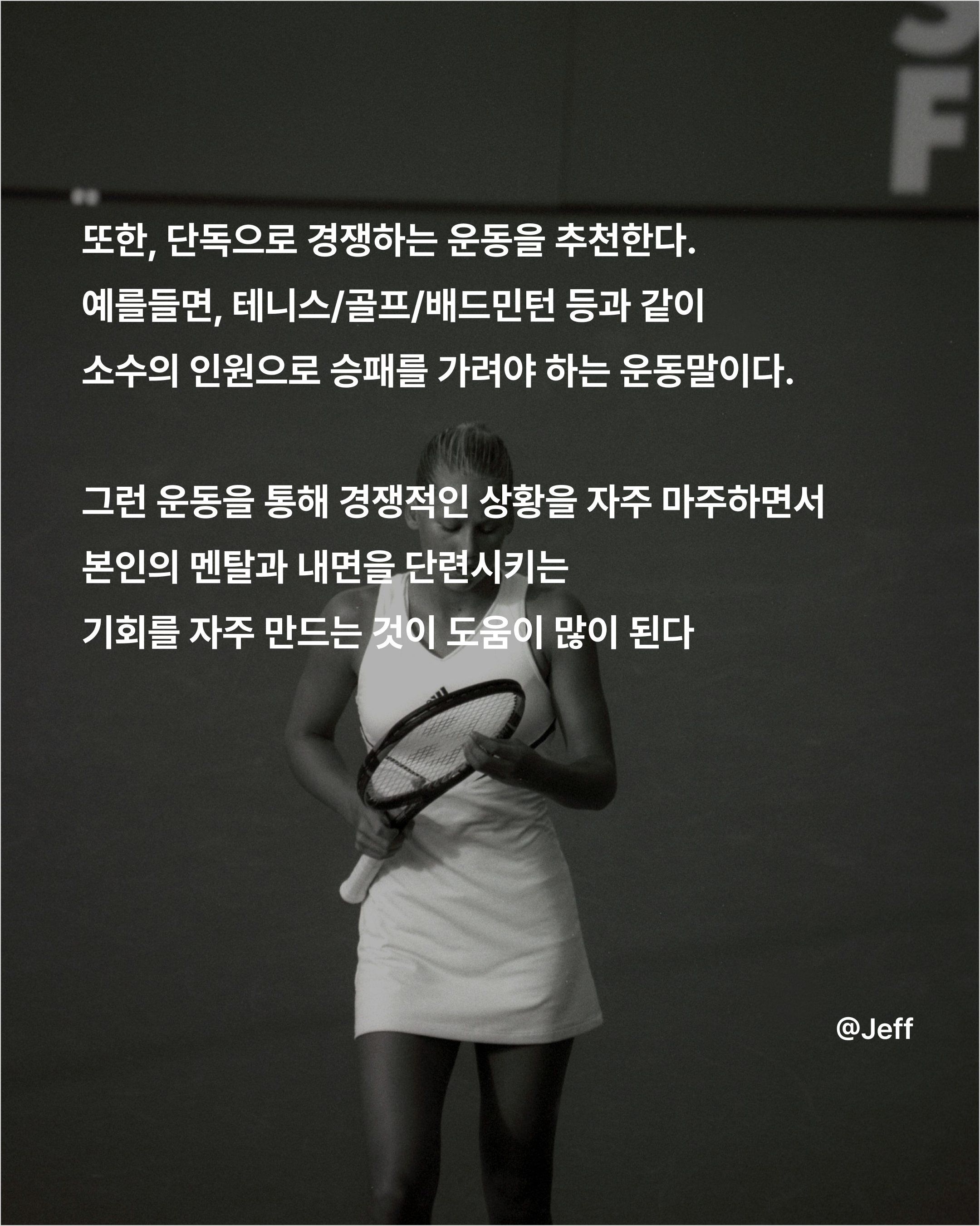또한, 단독으로 경쟁하는 운동을 하는 테니스, 골프, 배드민턴 등과 같이 소수의 인원으로 승패를 가려야 하는 운동을 통해 경쟁적인 상황을 자주 대면하면서 본인의 멘탈과 내면을 단련시키는 기회를 자주 만다는 것이 도움이 될 수 있다.