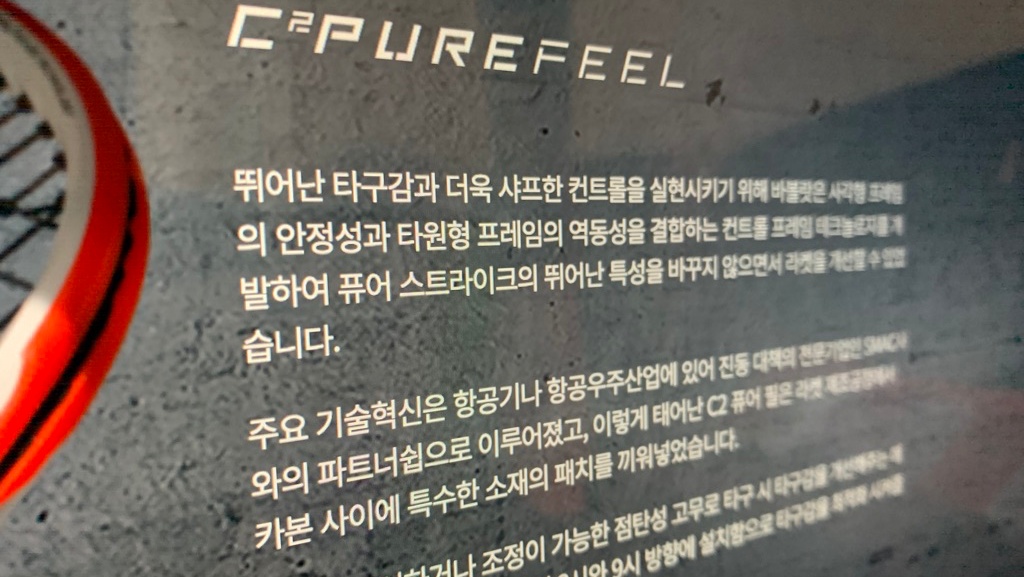 이번 퓨어 스트라이크의 주요 특징중에 한가지 " C2 Pure Feel " 입니다. 라켓의 3시, 9시 방향에 특수한 소재를 넣어 볼을 타격할 때 진동을 잡아주고 윌슨 블레이드처럼 먹먹하고 부드러운 타구감이 아닌 경쾌하면서도 플레이어의 팔에는 무리가 없는 소재를 넣었다고 합니다. 이런 소재의 특징이나 해당 소재가 어떠한 식으로 작용되는지 동호인 입장에서 전문적으로 알아야 할 필요는 없다고 생각합니다만