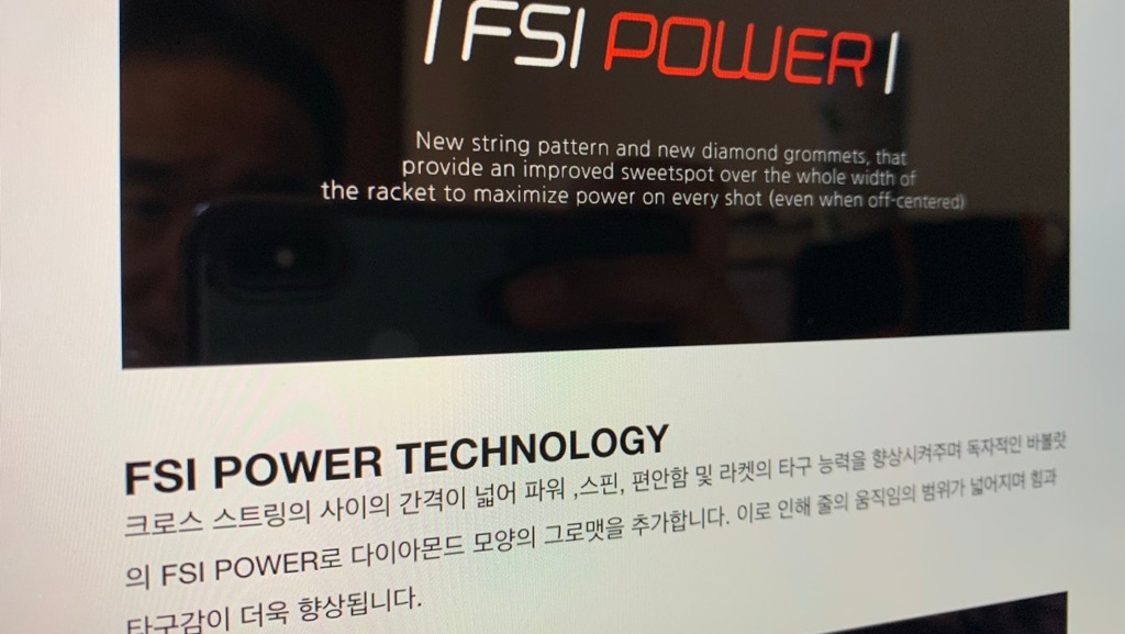 두번째 특징은 " FSI Power Technology " 입니다. 크로스 스트링의 사이 간격이 넓어 스핀과 파워에 이점이 있다고 설명하고 있는데요, 그래서 제가 직접 윌슨 RF97 오토그래프와 크로스 스트르링의 간격을 측정해 보았습니다.