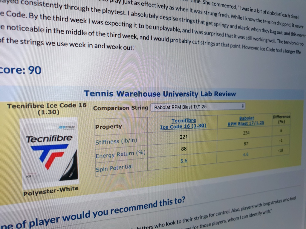 테니스웨어하우스에서 스트링 정보를 찾아보니 바볼랏 RPM Blast 보다 스트링 강성도 약하고 스핀 잠재력도 더 좋은 스트링임을 알 수 있었습니다. 종합 평점이 90 점이니 혹시나 이번에 [ 천연쉽 + 폴리 ] 조합이 만족스럽지 않으면 텐션을 더욱 낮춰 50 / 52 또는 48 / 46 정도로 사용해 보면 또 재미있는 실험이 될 것 같습니다.